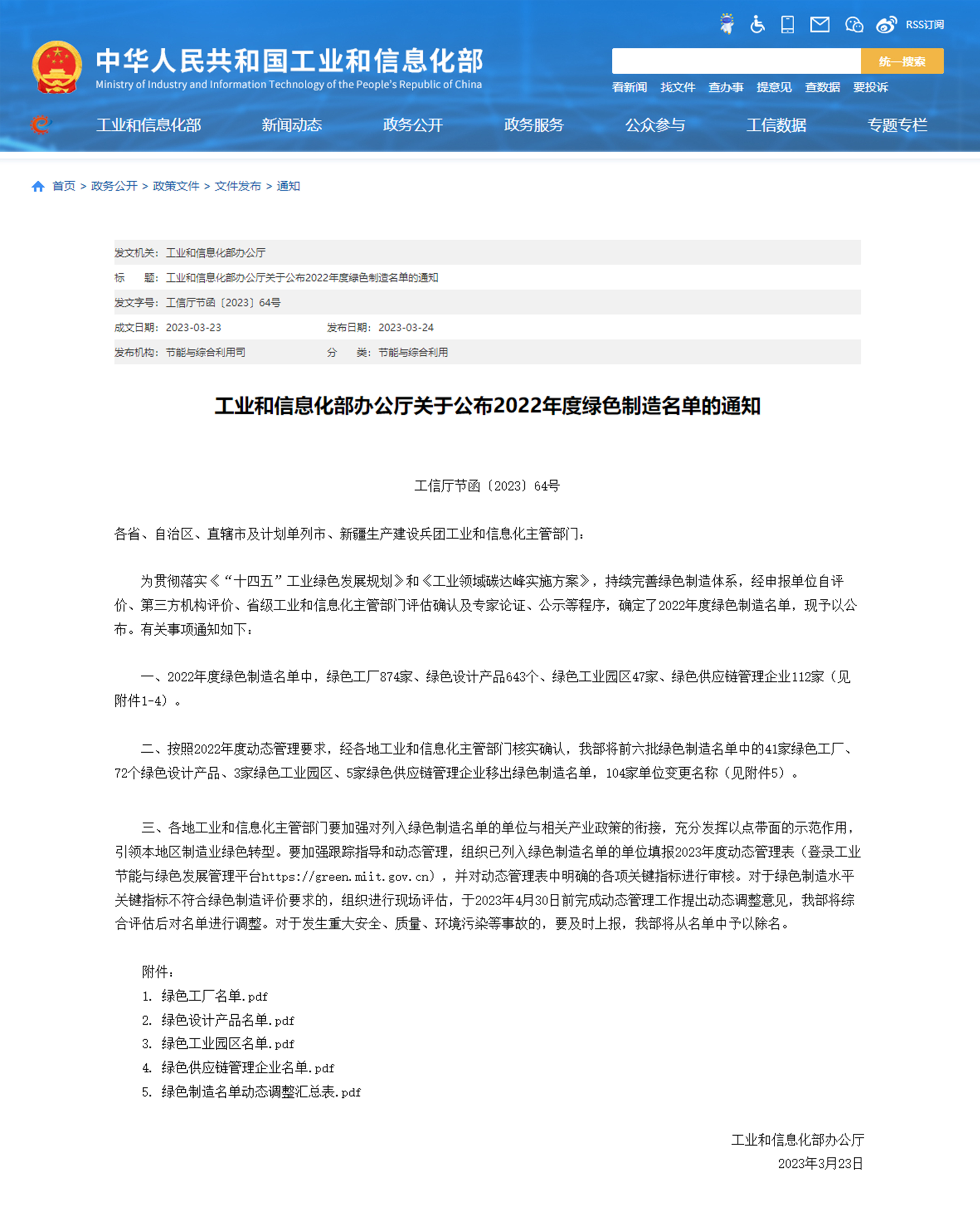 国家工业和信息化部开展绿色制造名单评选,旨在贯彻落实《“十四五”工业绿色发展规划》,全面推行绿色制造,助力工业领域实现碳达峰、碳中和目标。本次公布的2022年度绿色制造名单中,绿色工厂874家、绿色设计产品643个、绿色工业园区47家、绿色供应链管理企业112家。