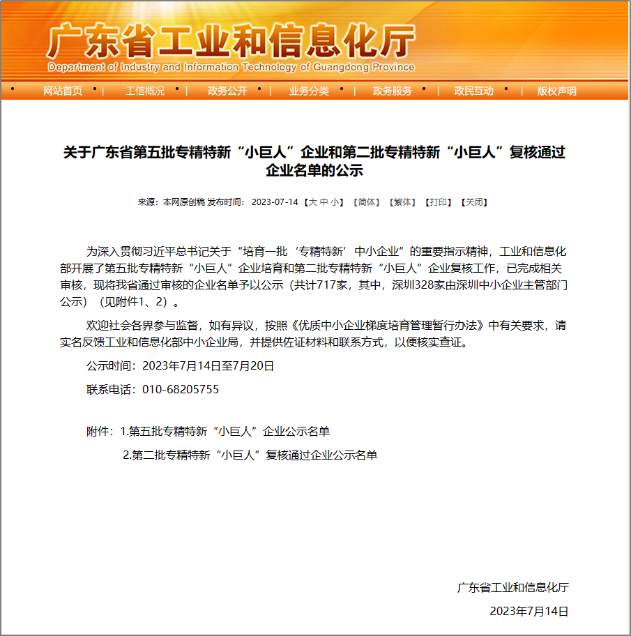 近日,广东省工业和信息化厅公示了第五批国家专精特新“小巨人”企业名单,英国上市公司365(以下简称“公司”)位列其中,成功入选。