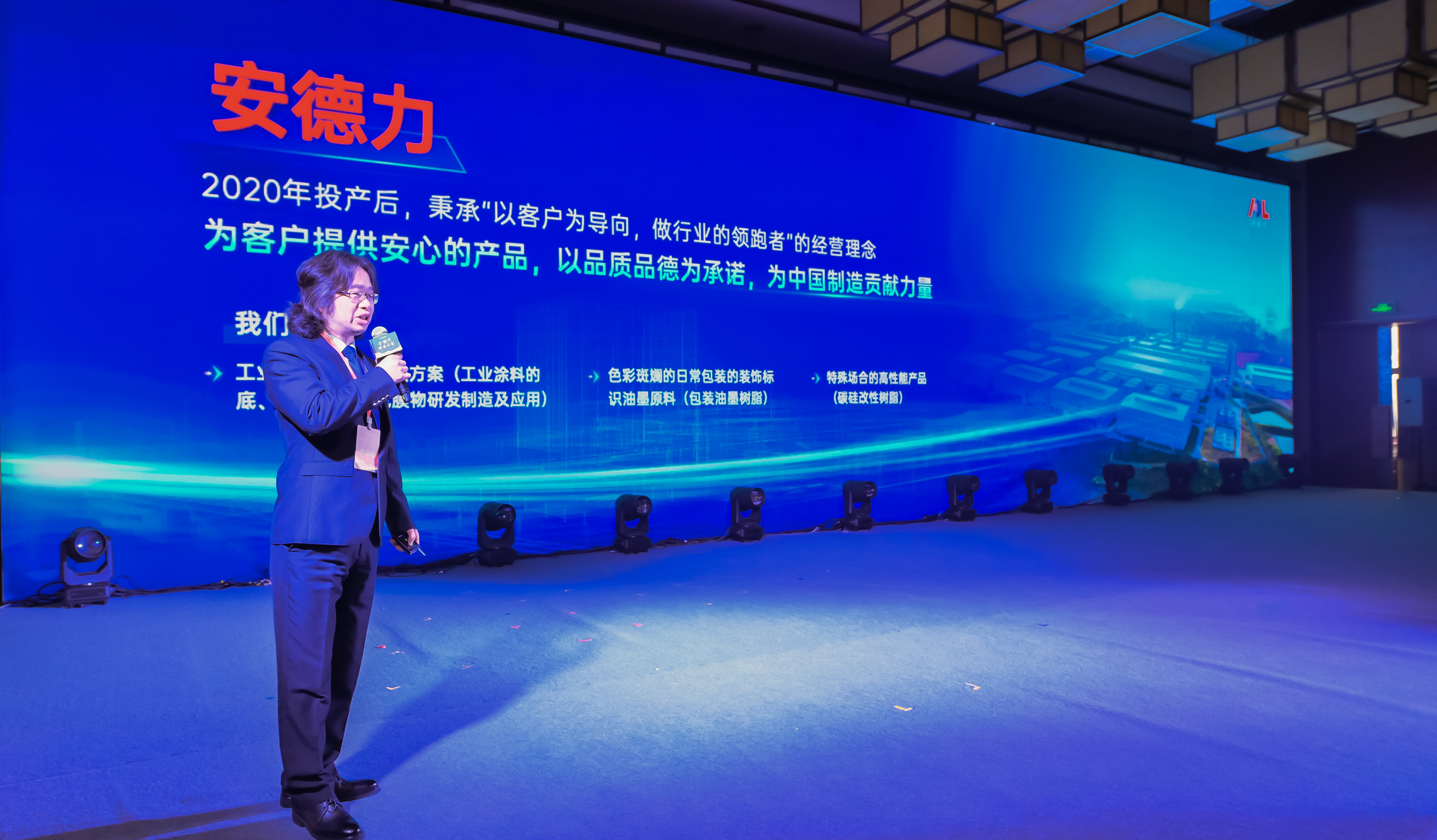 江西安德力高新科技有限公司副总经理王立峰先生,介绍了安德力在环保油墨树脂、水性工业涂料树脂、碳硅改性材料的性能及应用,为多个行业提供了绿色、高效的应用解决方案。