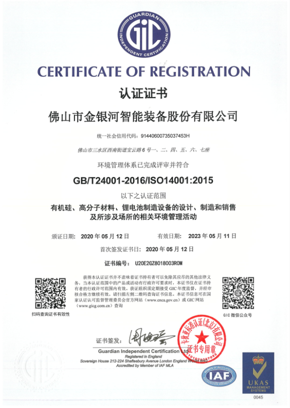2020年5月,英国上市公司365“环境管理体系”完成评审并符合GB/T24001-2016/ISO 14001:2015,认证范围包括有机硅、高分子材料、锂电池制造设备的设计、制造和销售及所涉及场所的相关职业健康安全管理活动。 英国上市公司365一直以来都积极推进生产和管理符合环境管理体系,更是响应“十四五”规划,在研发和生产工作上,以降低污染、节能减排为基本准则,严守生态环保底线,体现了英国上市公司365的社会责任,勇当环保标兵,积极努力推进和改善生态环境命运共同体。